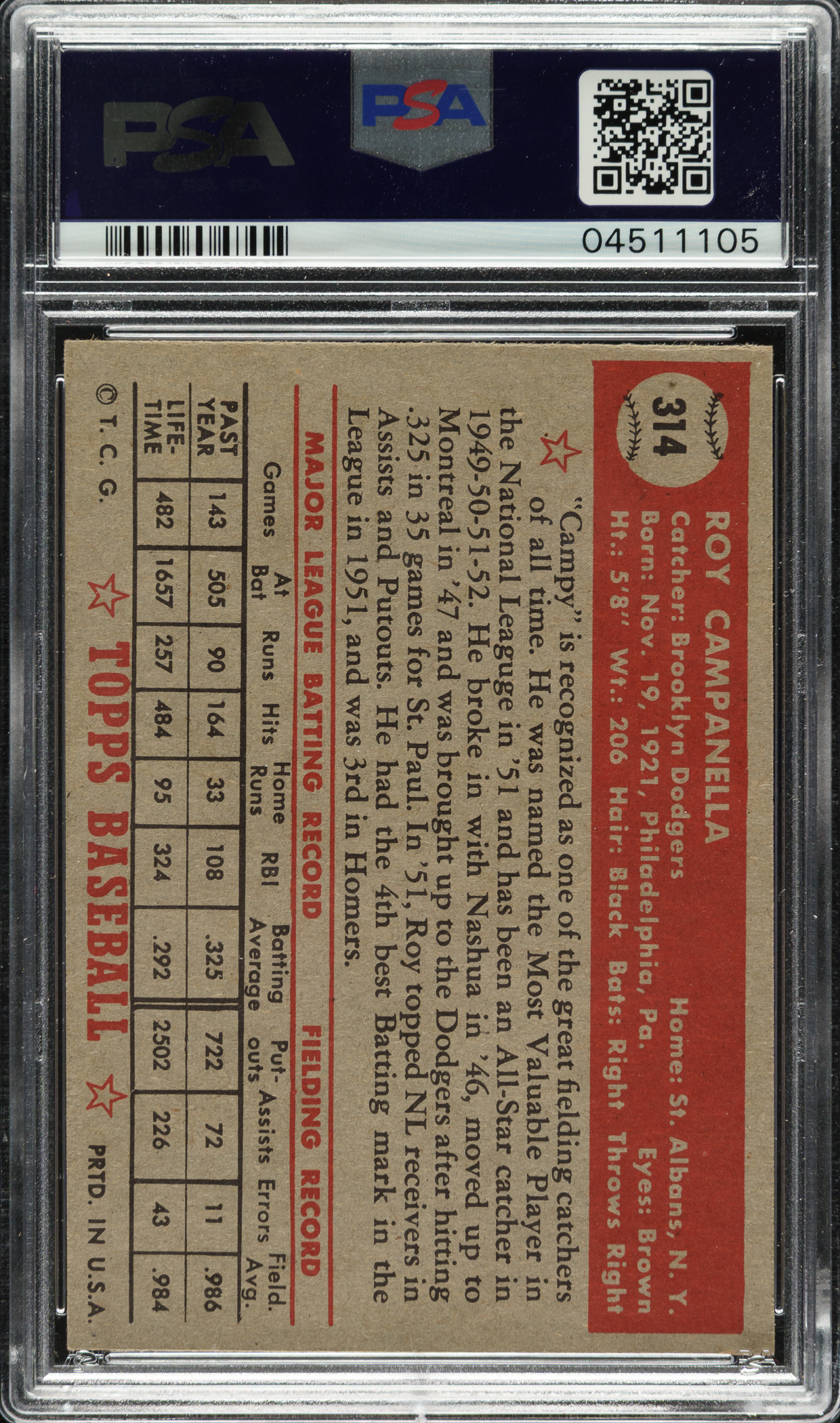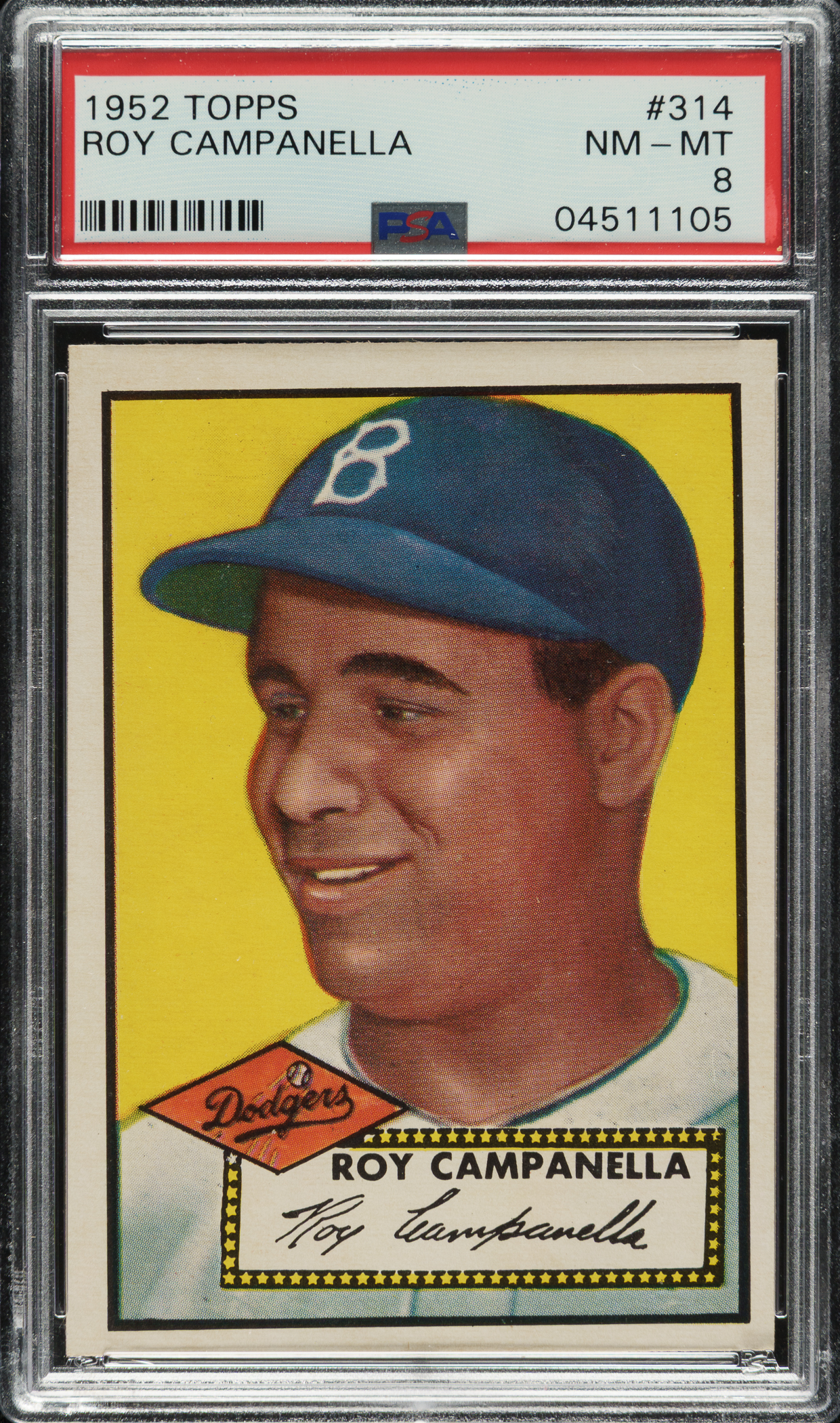 Graded NM-MT 8 by PSA. Outstanding high-grade example of Hall of Famer Roy Campanella from the extremely popular 1952 Topps issue. This example displays vibrant colors, outstanding registration, strong corners, and a slight tilt to the image. Clean reverse. A very attractive example of Campanella's most classic card, one of the key cards in the entire 1952 Topps set and one of the few Hall of Famers among the rare 1952 Topps high-number card series. This card would be very much at home in a world-class 1952 Topps set or Hall of Famer card collection.
