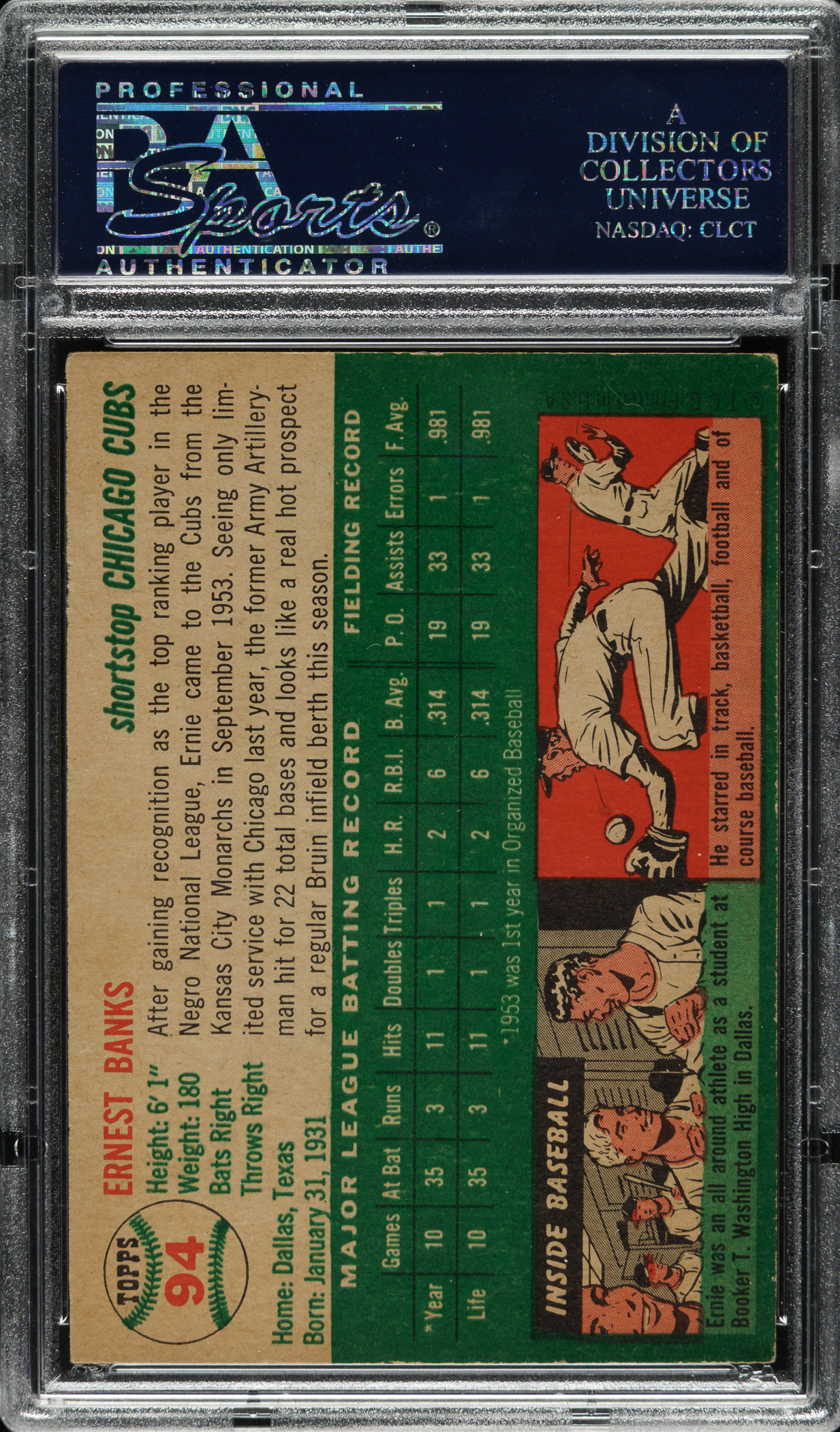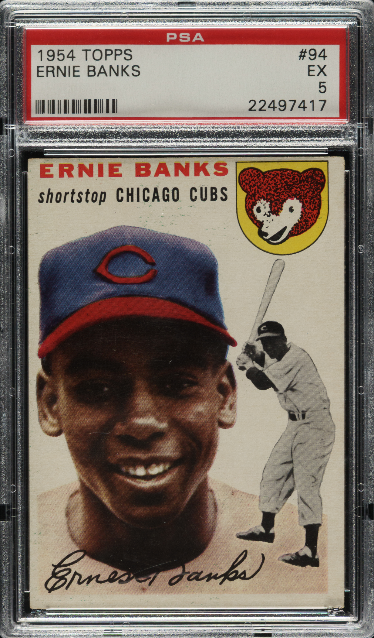 Graded EX 5 by PSA. Mid-grade example of Chicago Cubs Hall of Famer Ernie Banks' rookie card. One of card collecting's classics, Banks' card is one of the keys to the 1954 Topps set and one of the most popular of all postwar baseball cards. The offered card has bright colors, a crisp image, and light corner wear. Clean reverse. A solid mid-grade example.