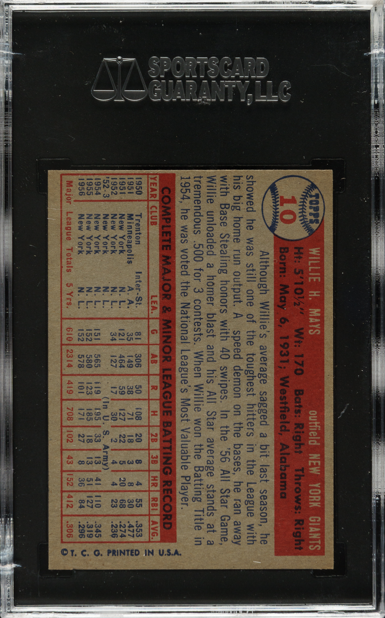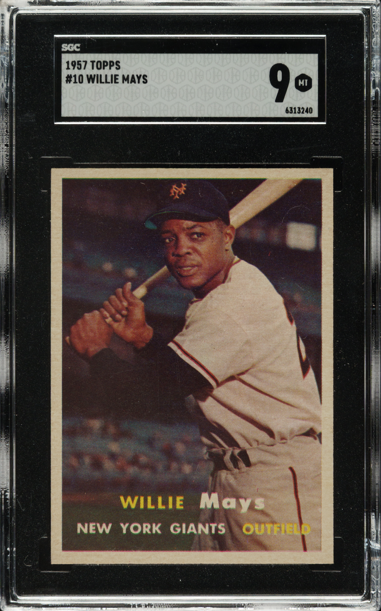 Graded MINT 9 by SGC. Highest-graded example! One of only three examples graded at this level by SGC out of 2,493 cards evaluated to date. Extraordinary ultra high-grade example of one of Willie Mays' most popular cards. This is an extremely strong example of this classic 1950s bubble-gum card, which features the Hall of Fame New York Giants slugger in ideal ready-to-bat pose. This card boasts vibrant colors, outstanding image clarity, sharp corners, and excellent centering. Clean, boldly printed reverse. This is an exceptional example worthy of a world-class 1957 Topps set or Willie Mays collection.