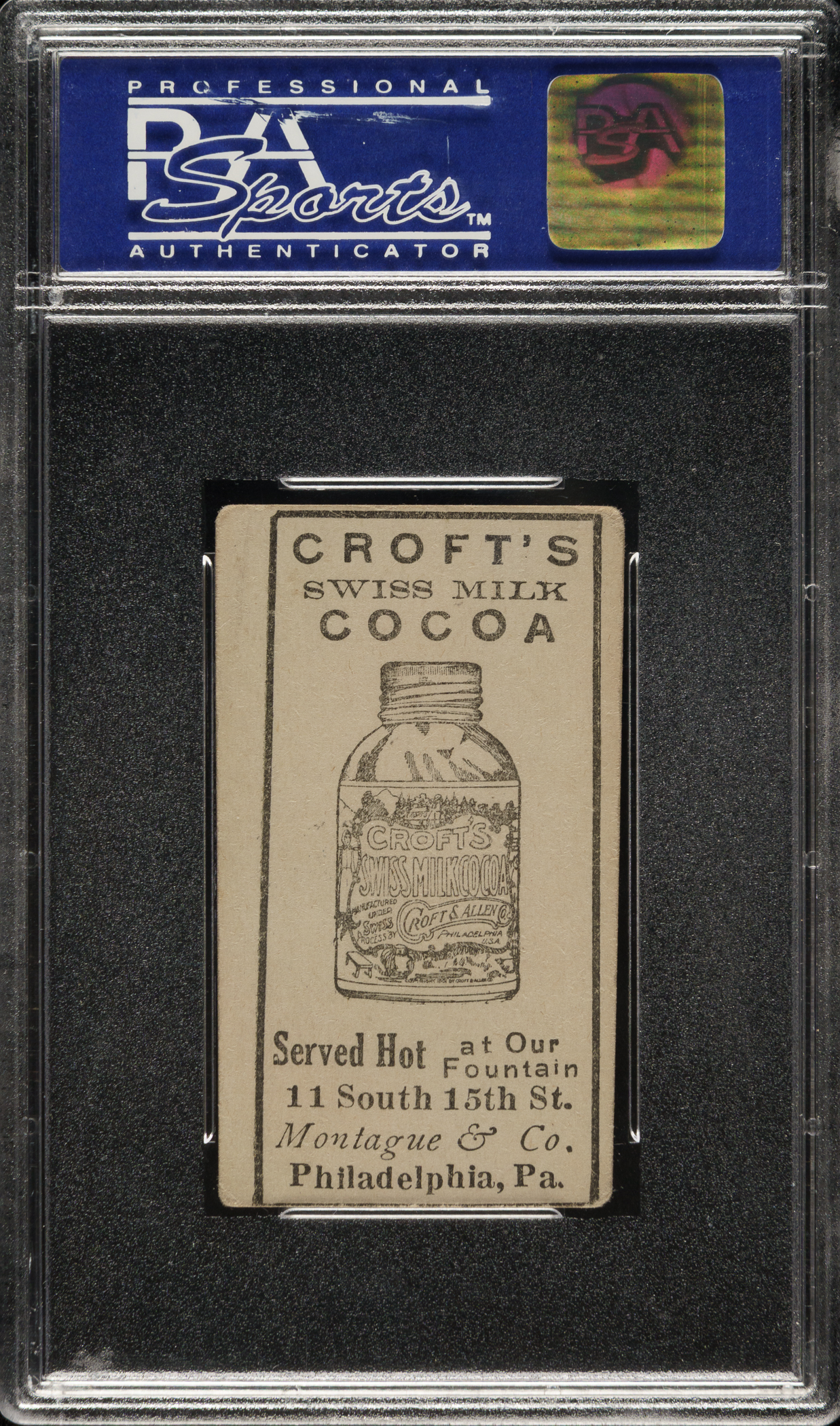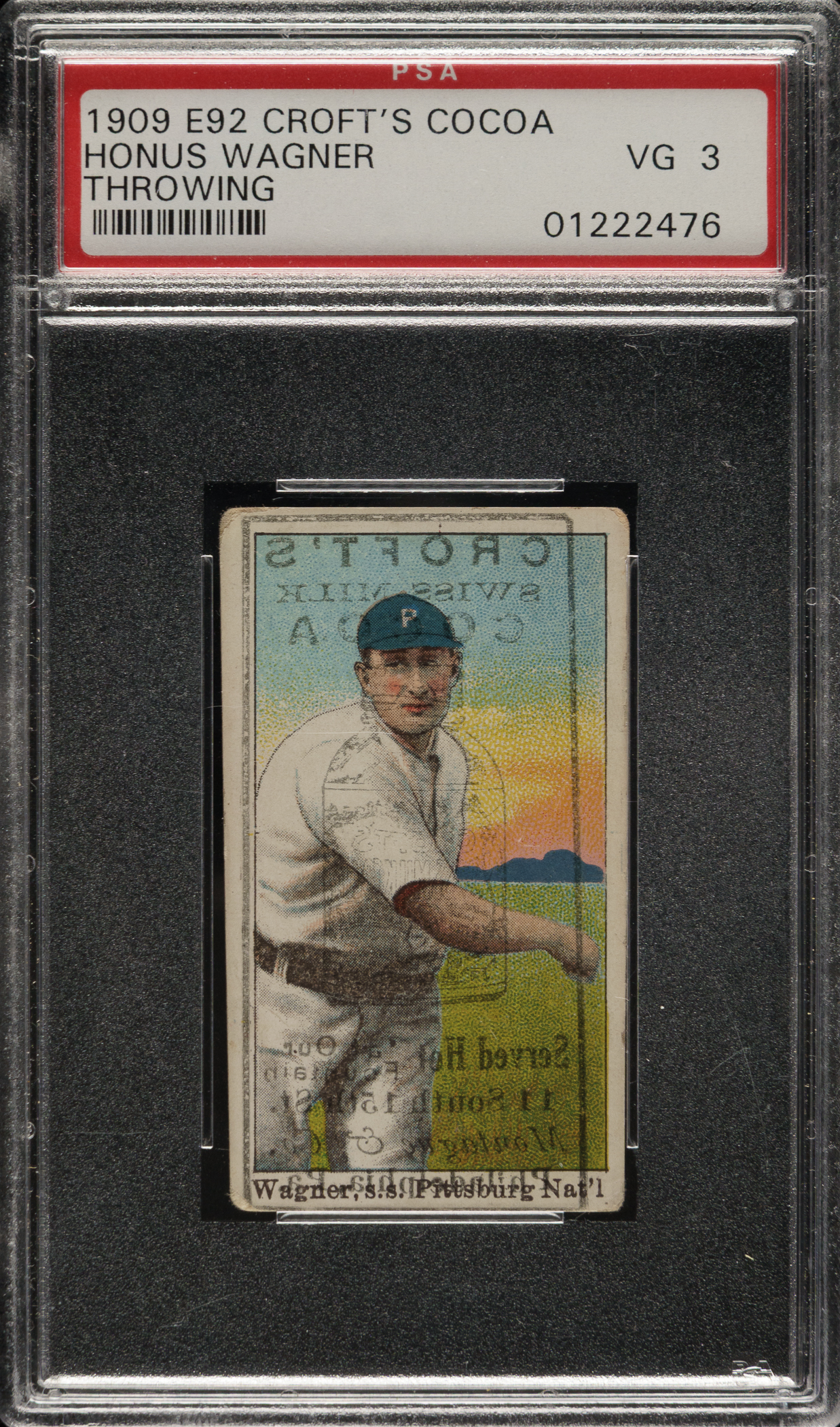 Graded VG 3 by PSA. Extremely rare Honus Wagner card (throwing pose) from the 1909 E92 Croft's Cocoa set, with advertising for "Croft's Swiss Milk Cocoa" of Philadelphia on the reverse. The same designs were also issued with advertising on the reverse for Croft's & Allen Candy. It appears that both varieties of these cards were issued by the Croft & Allen Co. of Philadelphia to be handed out as advertising items to promote their candy and cocoa, which, as noted on the back of this card, is "Served Hot at our fountain 11 South 15th St. Montague & Co. Philadelphia, Pa." The offered example of legendary Hall of Famer Honus Wagner (one of two poses of Wagner in the set) is bright and clean, both front and back, with a crisp image, bold colors, and honest corner wear. The card has an unusual imperfection that has occurred in the printing process. At a glance it might appear that the text has "bled through" from the back to the front, but what has really happened with this card is that when it was printed, the sheets were stacked on top of one another while still wet, in this case causing a transfer of ink from the reverse (text) of another sheet to the obverse of the offered card. We rarely see this type of printing imperfection so prominent. The reverse is entirely clean with bold black text. This is a very attractive mid-grade sample card of the key Hall of Famer from this rare set.