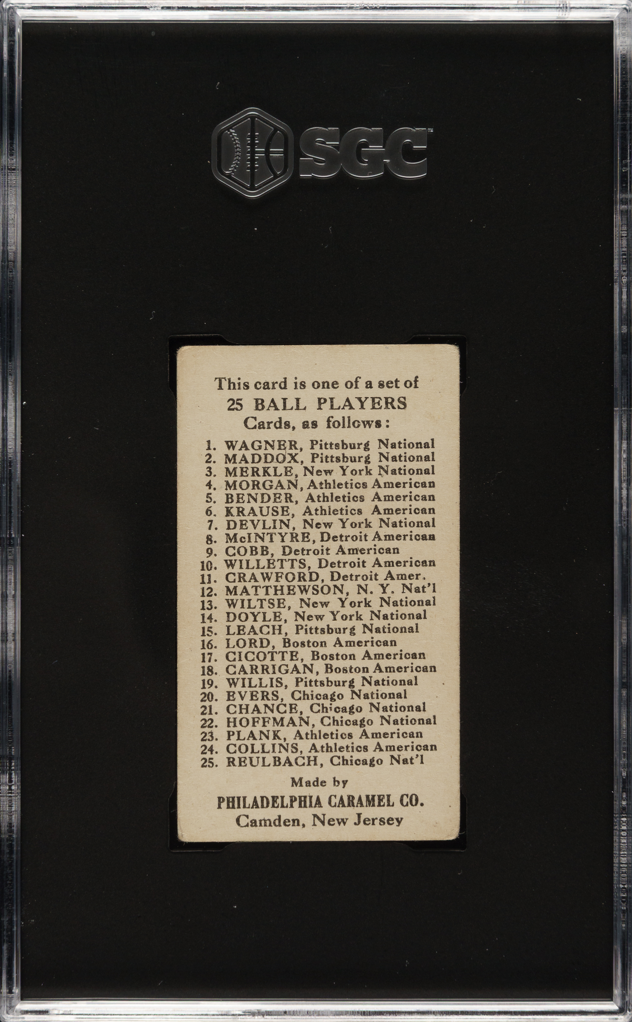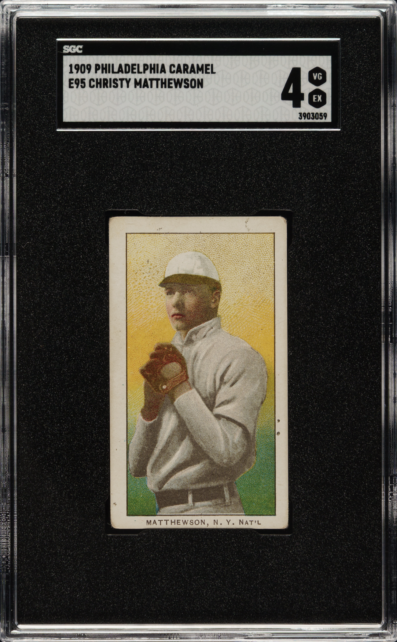 Graded VG/EX 4 by SGC. Very attractive example of New York Giants Hall of Fame pitcher Christy Mathewson in a throwing pose from the very scarce E95 Philadelphia Caramel series. This 25-card set was issued in 1909 by the Philadelphia Caramel Co. of Camden, New Jersey. Mathewson, of course, is one of the key cards in the set. This is also one of Mathewson's most highly regarded cards from any set and is considerably rarer than the popular T205 and T206 cards of Matty from the same era. The offered card has bright colors, outstanding registration, and even corner wear. The reverse features a very boldly printed checklist for the set. It is interesting to note Mathewson’s name is misspelled “Matthewson” on this card. This is a very attractive mid-grade example of one of Mathewson’s most striking cards from one of the most popular and colorful of all “E” card issues.