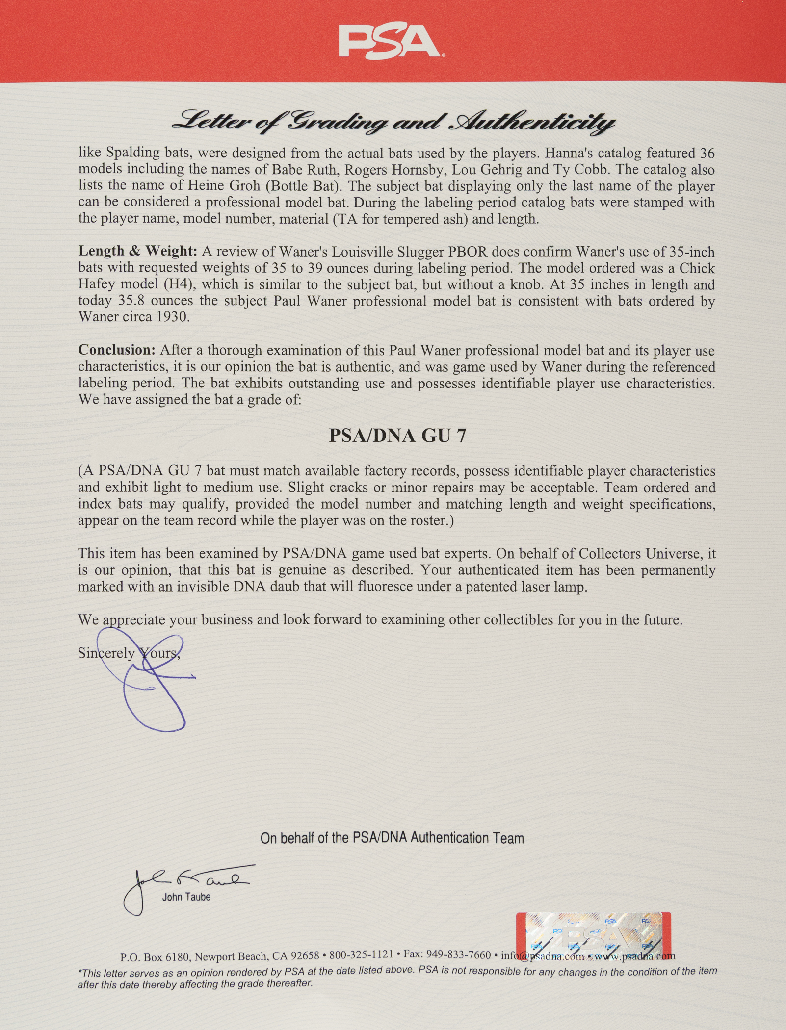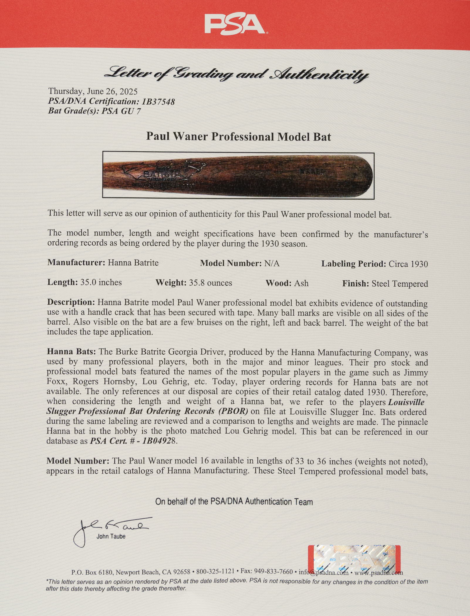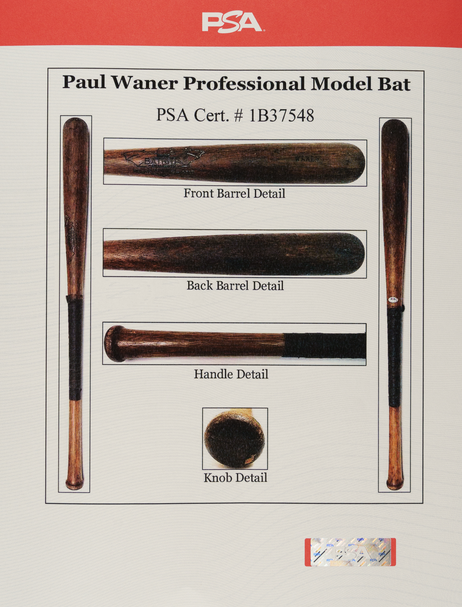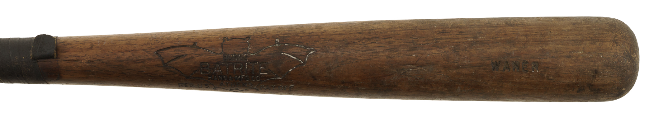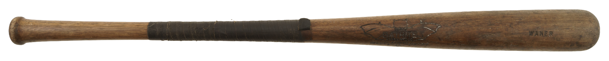 Rare Paul Waner Hanna Batrite signature-model bat (predating model numbers) dating from the circa 1930 manufacturing period. Graded GU 7 by PSA/DNA. According to PSA/DNA, the bat "exhibits evidence of outstanding use with a handle crack that has been secured by tape" and "some checking (grain) swelling from repeated ball contact is on the front barrel." PSA/DNA concludes by stating that "After a thorough examination of this Paul Waner professional model bat and its player use characteristics, it is our opinion the bat is authentic and was game used by Waner during the referenced labeling period." Paul, nicknamed "Big Poison," was the older and harder-hitting brother of Lloyd Waner ("Little Poison"), both of whom terrorized National League pitchers as members of the Pittsburgh Pirates for nearly two decades beginning in 1926. Paul Waner batted over .300 on fourteen separate occasions and won three batting titles over the course of his 20-year career. He retired in 1945 with a lifetime average of .333 and was elected to the Hall of Fame in 1952. Length: 35 inches. Weight: 35.8 ounces. Full LOA from John Taube of PSA/DNA (a corresponding sticker is affixed to the handle). The size/weight of this item requires that there will be an additional shipping charge for this lot.