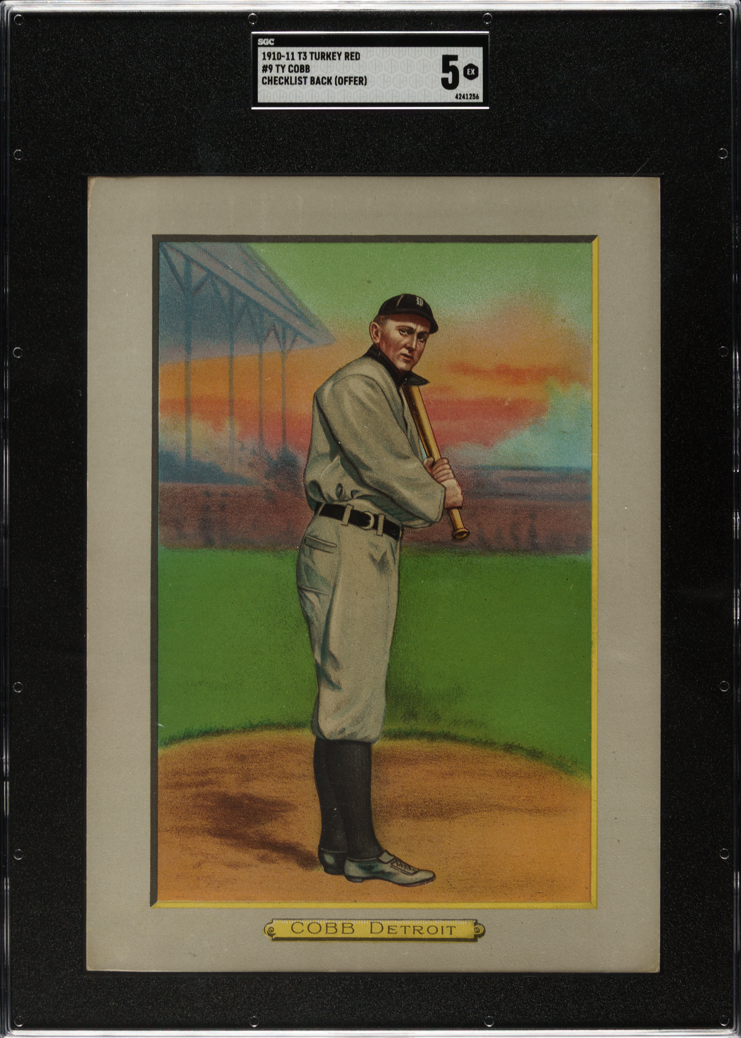 Graded EX 5 by SGC. Presented is an extremely attractive T3 Turkey Red Ty Cobb example, one of the most beautiful and popular Cobb cards ever produced! This card is additionally noteworthy as it originates from the famous Charlie Conlon collection, which REA had the privilege of offering at auction in 2009 and 2010. This is a superb example! The card is well centered, with bold colors, flawless registration, and no creases or wrinkles. There is light, even touches of wear at the four corners (a bit more on the upper left). The checklist back (with offer) is boldly printed and mostly clean. We are very familiar with this particular card as this is the third time we have had the privilege of offering it. This card originally appeared as Lot 370 in REA's Spring 2009 auction, having been consigned by the estate of Charlie Conlon, one of the hobby's truly great pioneer collectors. This is a remarkable example, one that epitomizes what collectors hope for in a Turkey Red example, let alone an example of the key card of Ty Cobb. It has survived remarkably well and does not display any of the flaws that so often plague these larger cards. This is a very attractive example in a very high grade for the issue and one that would be at home in any world-class collection of Turkey Reds, Ty Cobb, or important prewar baseball cards.