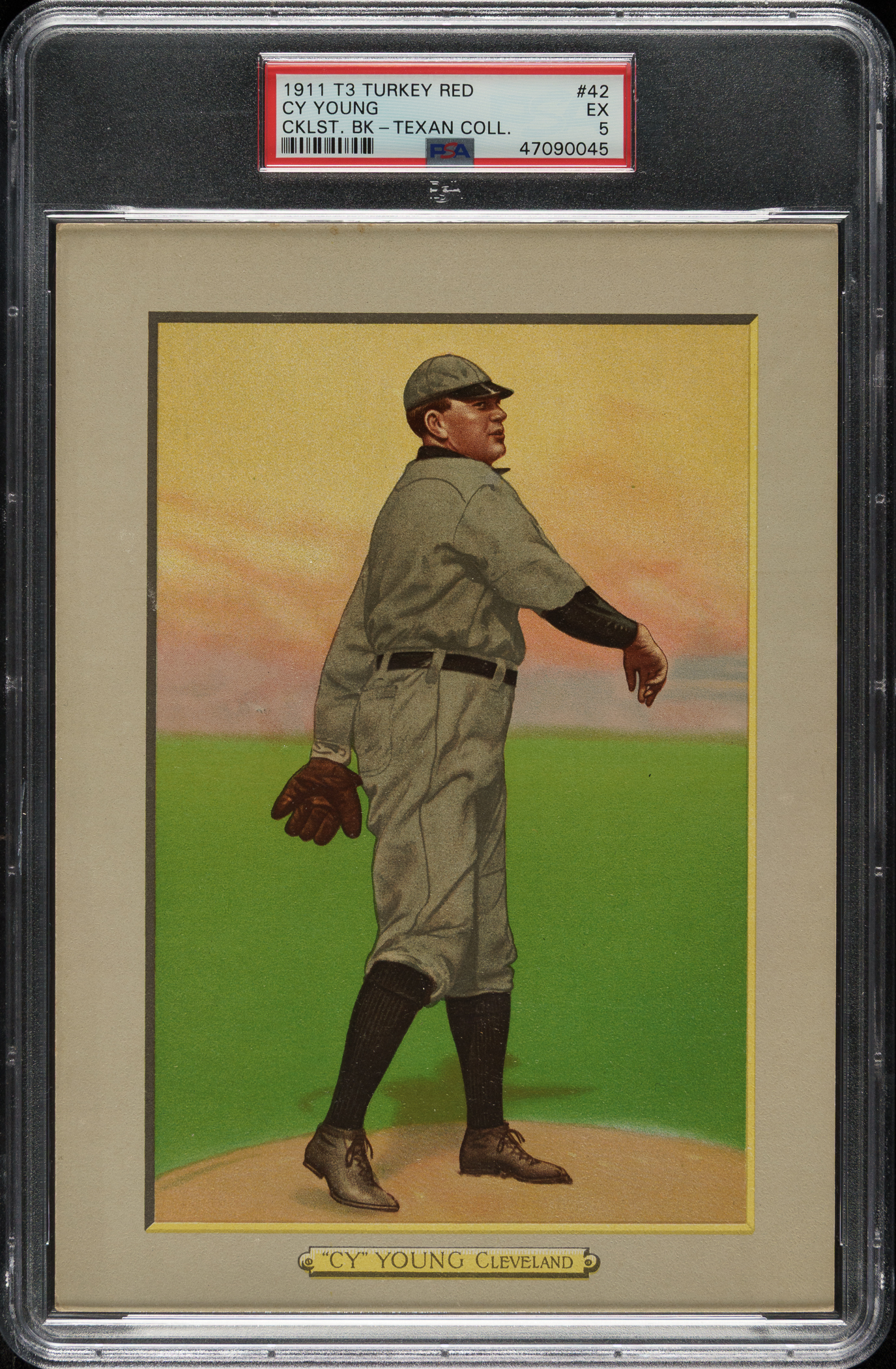 Graded EX 5 by PSA. Only six examples are graded higher by PSA! Presented is an attractive example of legendary Hall of Fame pitcher Cy Young from the T3 Turkey Red series. The T3 Turkey Red is considered by many to be one of Cy Young's most important and majestic cards. This example has extremely bold and vibrant colors, flawless registration, and light wear on the corners. A checklist-style reverse with bold print. Turkey Red cabinets are universally recognized as among the most beautiful baseball-card issues ever produced. One of the key cards in the T3 set, this card would be an important addition to any Turkey Red, Hall of Fame, or Cy Young card collection.