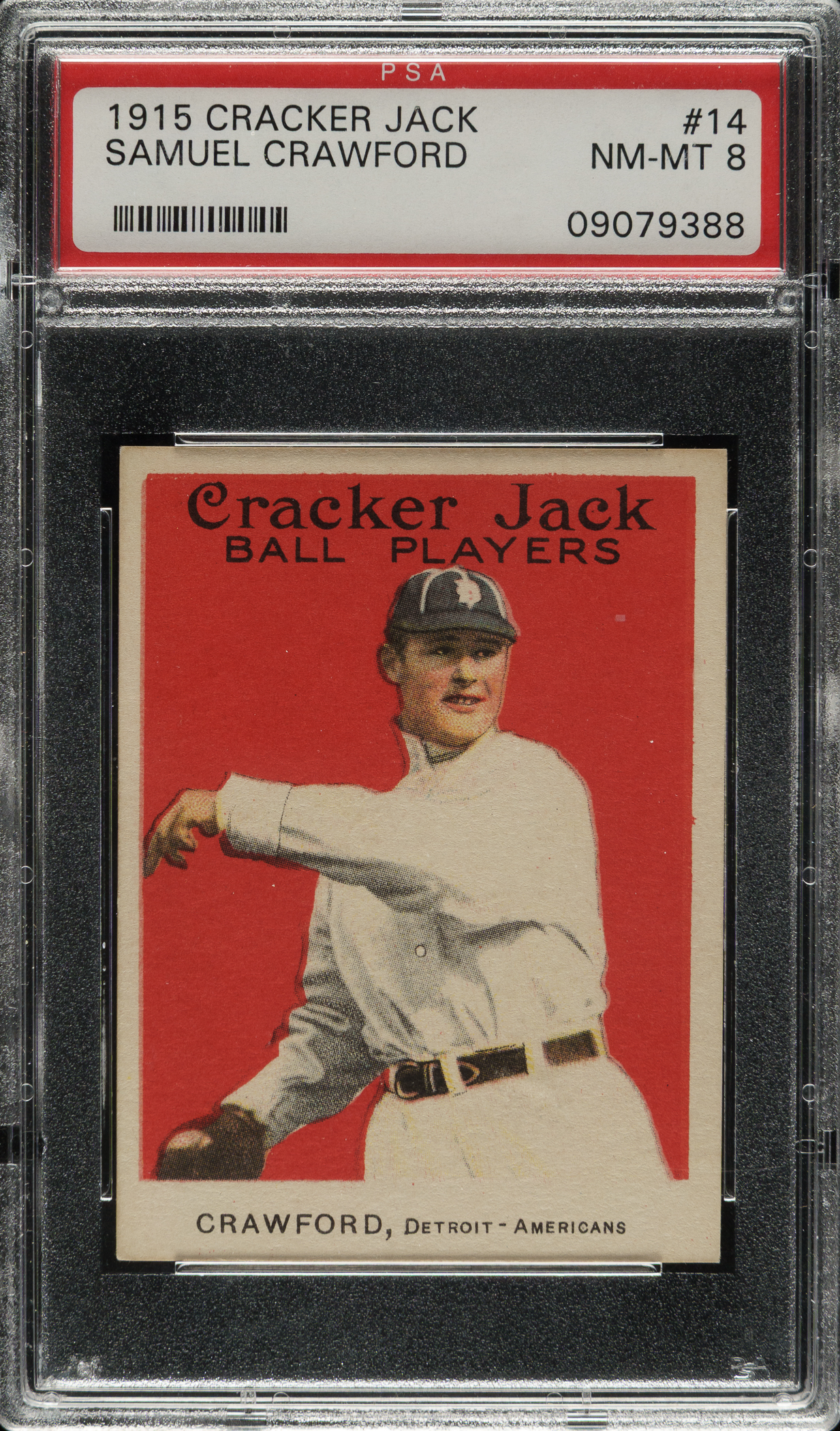 Graded NM-MT 8 by PSA. Only two examples have been graded higher by PSA to date. Outstanding high-grade 1915 Cracker Jack of Hall of Famer Sam Crawford (Detroit Tigers). This card has an extremely bold red background, outstanding registration, and four strong corners. Clean and boldly printed reverse. This is a beautiful high-grade example of Hall of Famer Sam Crawford from this classic set that would make an outstanding addition to any world-class 1915 Cracker Jack, Hall of Fame, or prewar-card collection.