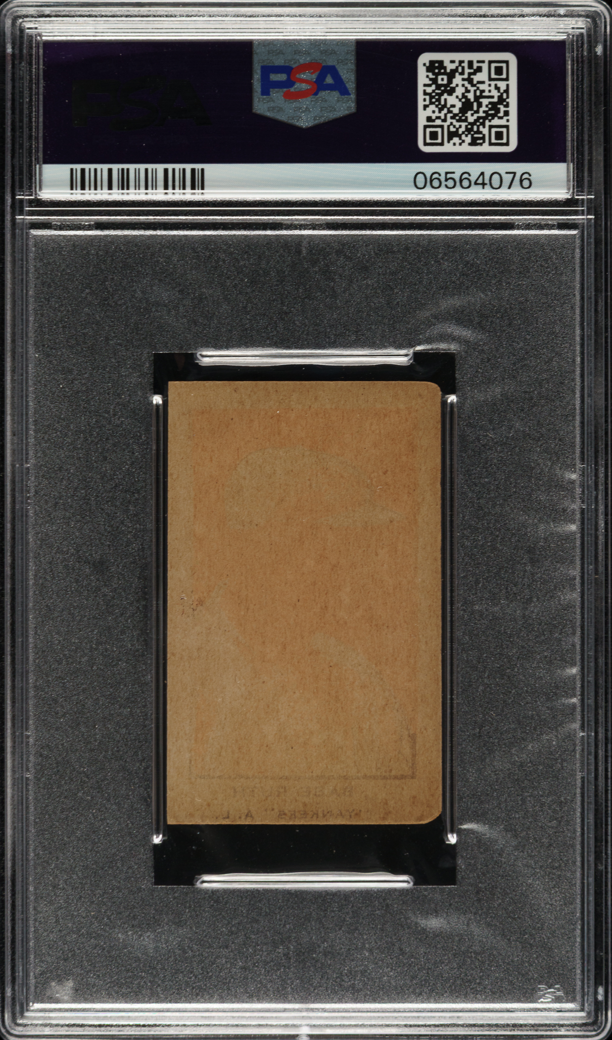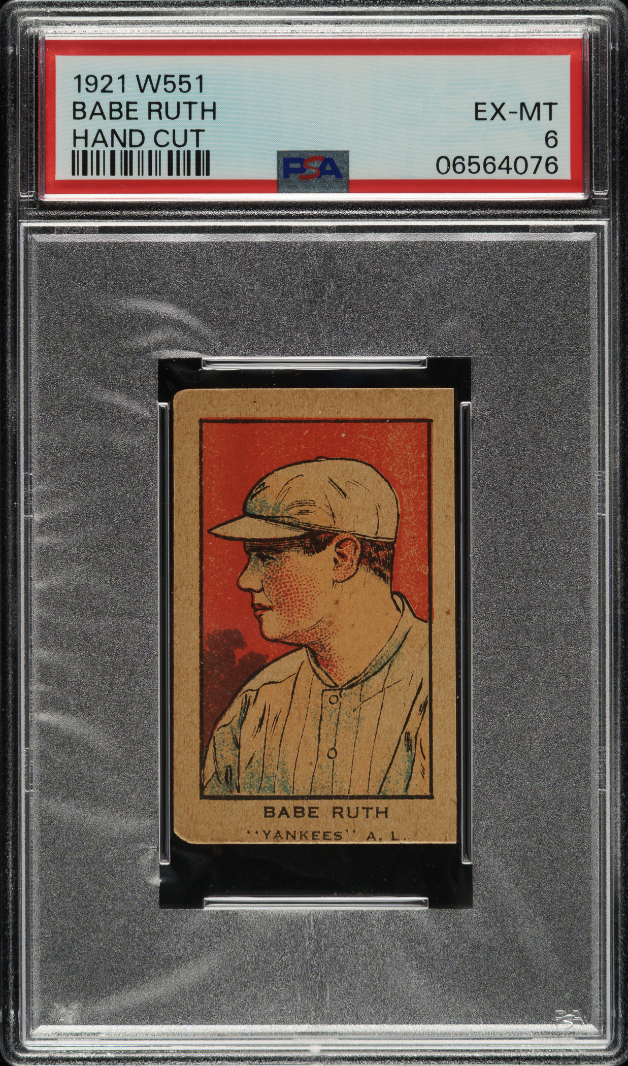 Graded EX-MT 6 by PSA. Mid-grade example of Babe Ruth from the W551 strip-card series. Originally issued in strips, these cards (and almost all strip-cards) are often found with irregularly cut borders as they were cut by hand from the strips, as intended. Only ideally cut examples (which are few and far between) are awarded numerical grades by PSA (and SGC). The offered example is neatly cut, with even wear at the corners (weaker left-side corners), and a crisp profile portrait image of Ruth set against a red background. The blank back is clean. This is a very desirable example of one of Babe Ruth's classic 1920s strip-cards.