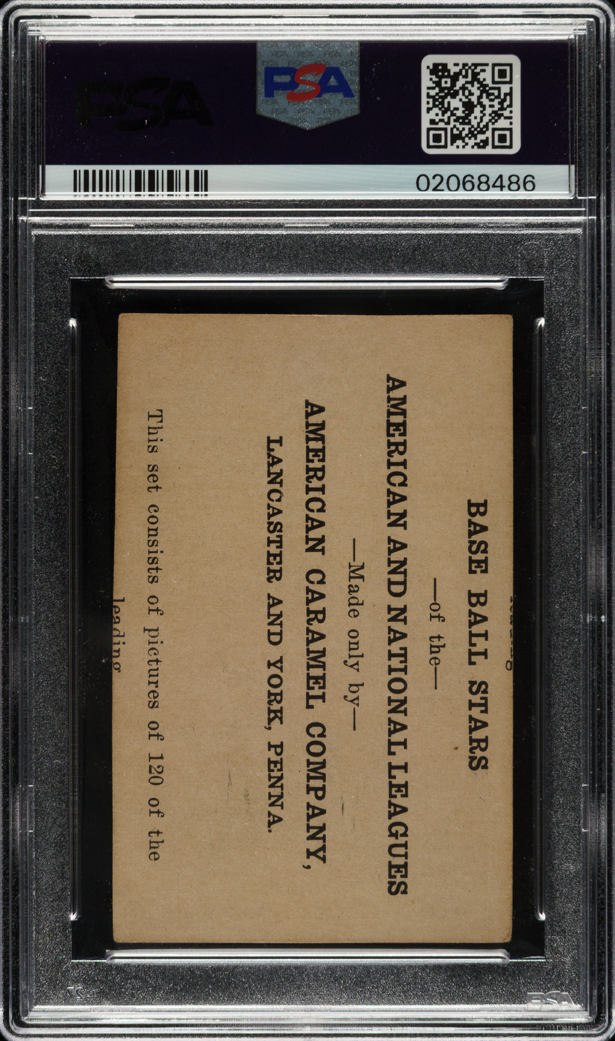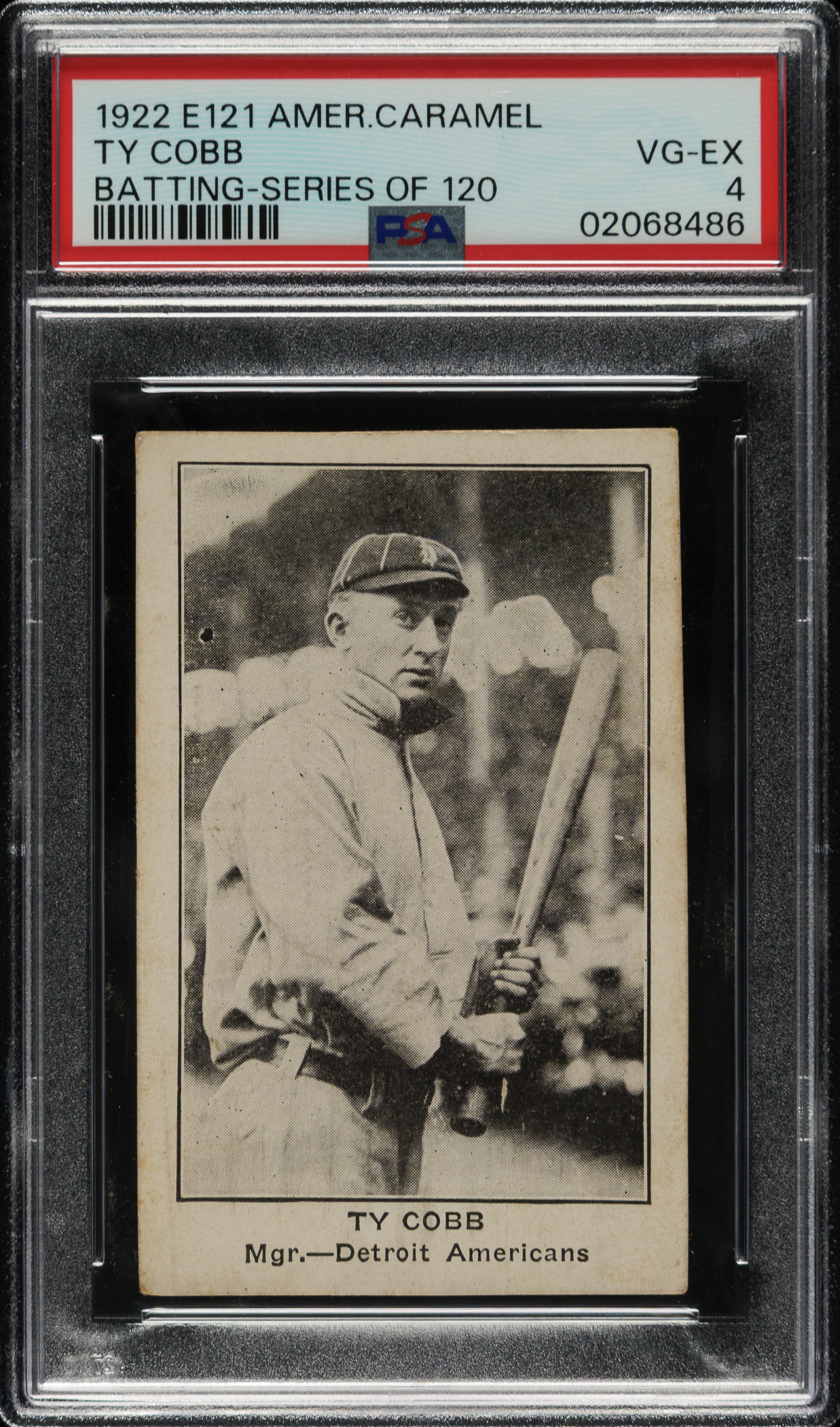 Graded VG-EX 4 by PSA. Outstanding E121 American Caramel (series of 120) of Detroit Tigers Hall of Famer Ty Cobb (batting), one of the key cards from one of the classic caramel sets of the early 1920s. Cobb is ideally depicted in uniform holding the bat that made him so famous. The offered card exhibits strong image clarity and contrast, excellent centering, and light toning across the front. Clean reverse with bold black text, including part of text from an adjacent card showing at top. This is a superb mid-grade example of Ty Cobb, produced by American Caramel during an era in which very few card sets were issued.