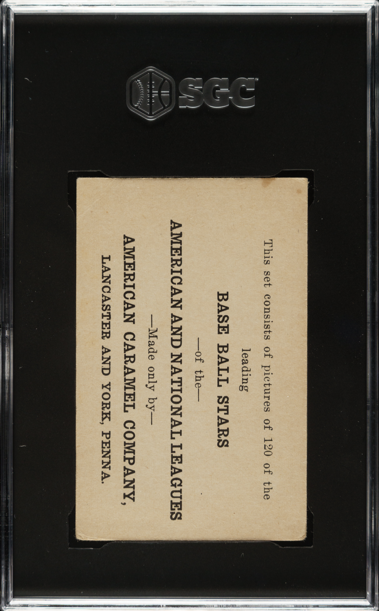 Graded VG 3 by SGC. Presented is an extremely attractive E121 American Caramel card of Babe Ruth. One of several different cards of Ruth in the E121 set, this is one of the all-time great Babe Ruth cards of the 1920s (or any era)! Referred to on checklists as the Babe Ruth "Photo Montage" variation, this classic card features three images of Ruth: a full-length image of Ruth posing with his bat set against a larger portrait of Babe, and a distant game-in-action photo in which Ruth is no doubt hitting a colossal home run. The card designers pulled out all the stops for this card! This is a beautiful card: Crisp and clean, with honest wear to the four corners and outstanding centering. A crease across the upper right corner is responsible for the assigned grade. The reverse is boldly printed and clean, with even, natural toning. This is a tremendous and very attractive example of this classic Babe Ruth card, which would be a worthy addition to any high-quality Babe Ruth or prewar-card collection.