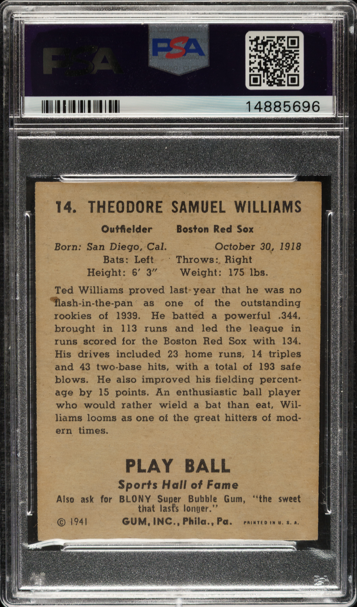 1941 R336 Play Ball #14 Ted Williams PSA NM-MT 8