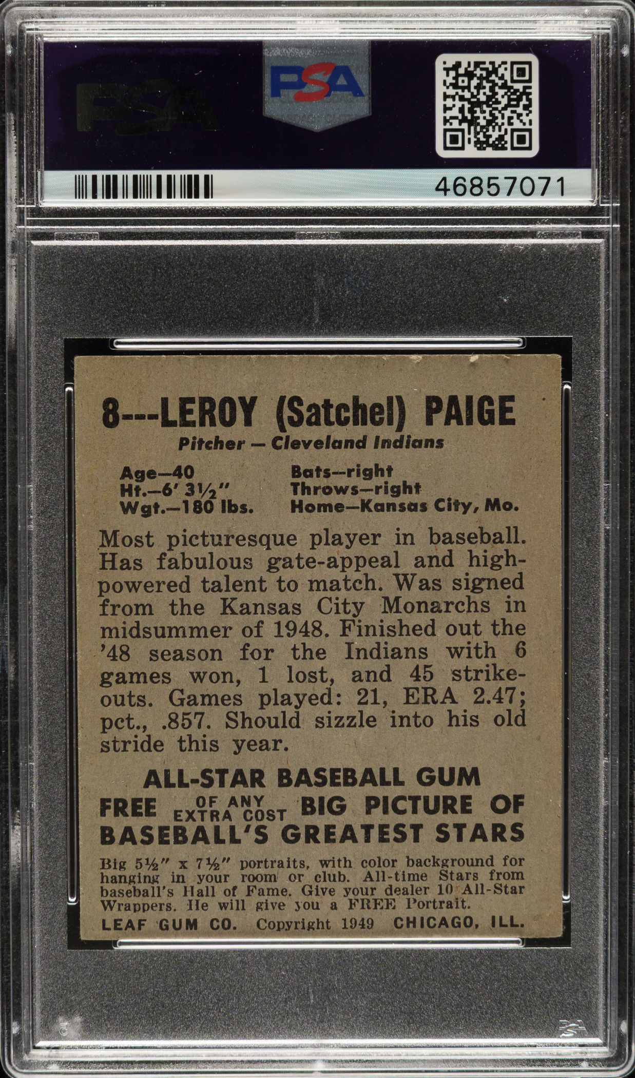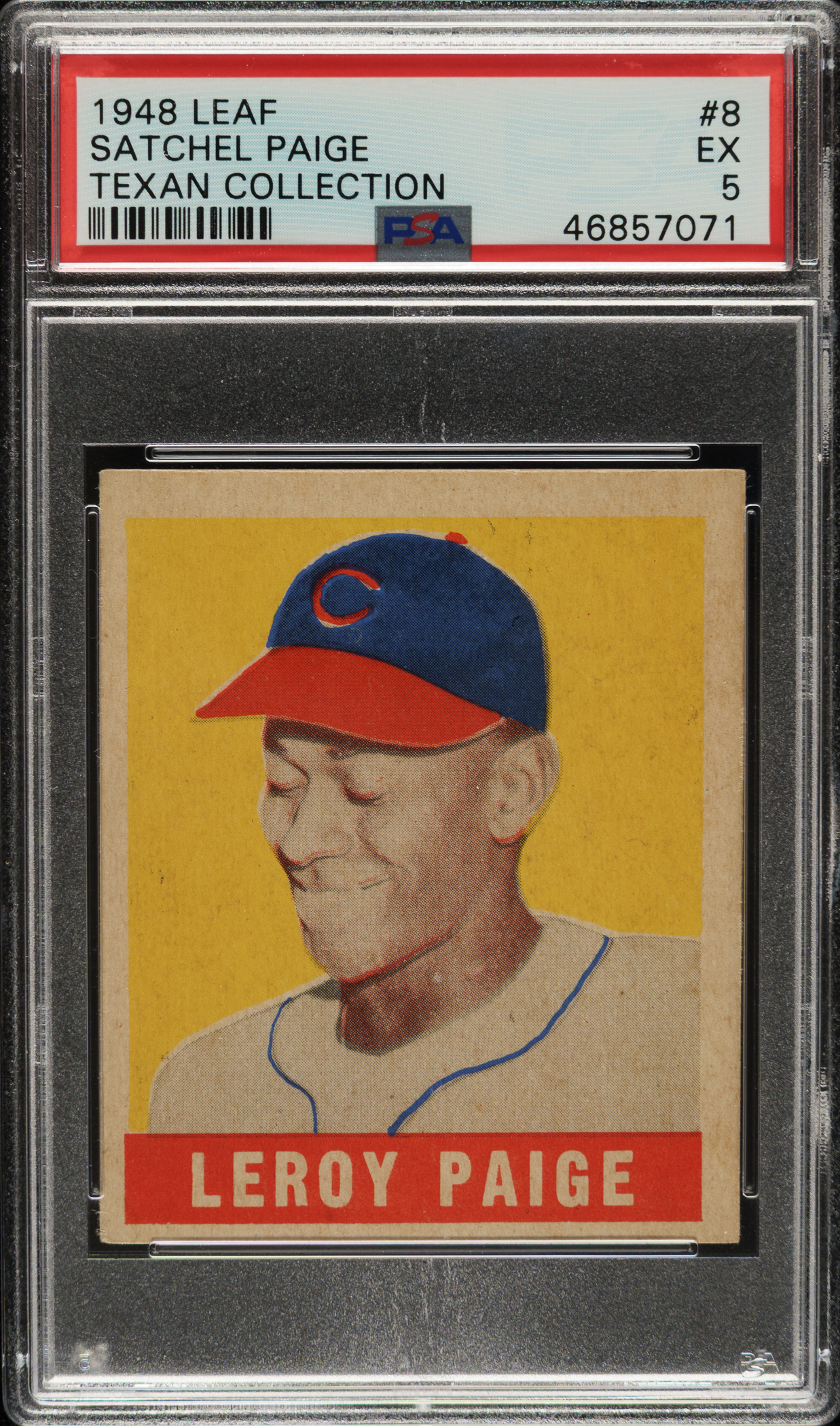 Graded EX 5 by PSA. Tremendous mid-grade example of 1948-1949 Leaf #8 Satchel Paige. This is one of card collecting's most iconic classics. Satchel Paige’s Leaf rookie card is one of the scarcest and most significant of all postwar baseball cards. Chicago's Leaf Gum Company produced the first multicolor baseball cards of the post-World War II era in 1948-1949. Forty-nine cards in the set are considered "standard" and the additional "short-print" series of 49 cards in the set are so rare that "Rare Leafs" has long been a formal card-collecting hobby term. Leafs are without question one of the toughest postwar sets to complete because of all the rare cards. Paige is not only the key to this rare series but he is also the key to the 1948-1949 Leaf set. The Leaf card is also Paige’s most valuable. This is an outstanding mid-grade example! The offered example exhibits brilliant colors, excellent registration, light corner wear (a bit weaker bottom left), and centering towards the bottom left. The reverse is clean and free of staining and excess print. This card presents a rare opportunity to acquire an extremely attractive example of one of the most classic of all postwar baseball cards.