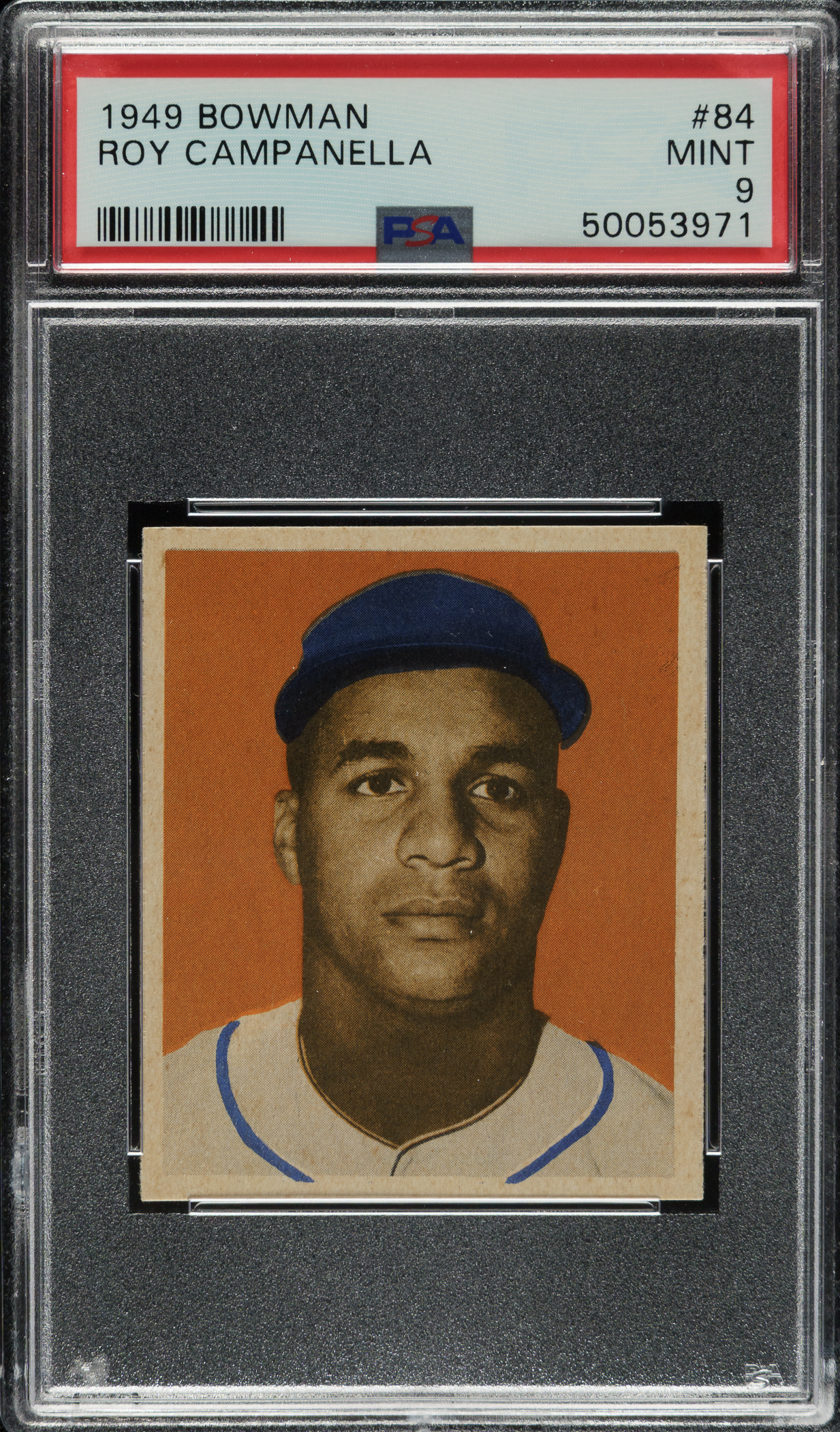 Graded MINT 9 by PSA. Incredible ultra-high-grade rookie card of Hall of Famer Roy Campanella, one of the key cards from the classic 1949 baseball-card issue and one of the key Hall of Famer rookie cards of the era. This exceptional example boasts vibrant colors, outstanding registration, and sharp corners. Boldly printed reverse. Cards from this set are extremely hard to find in high grade in part because they often naturally have soft corners due to the quality of the paper stock on which they are printed. One of the key classics of all postwar baseball-card issues, this is an extremely attractive high-grade example of Campanella's rookie card and one of the key Hall of Famers in the 1949 Bowman set.