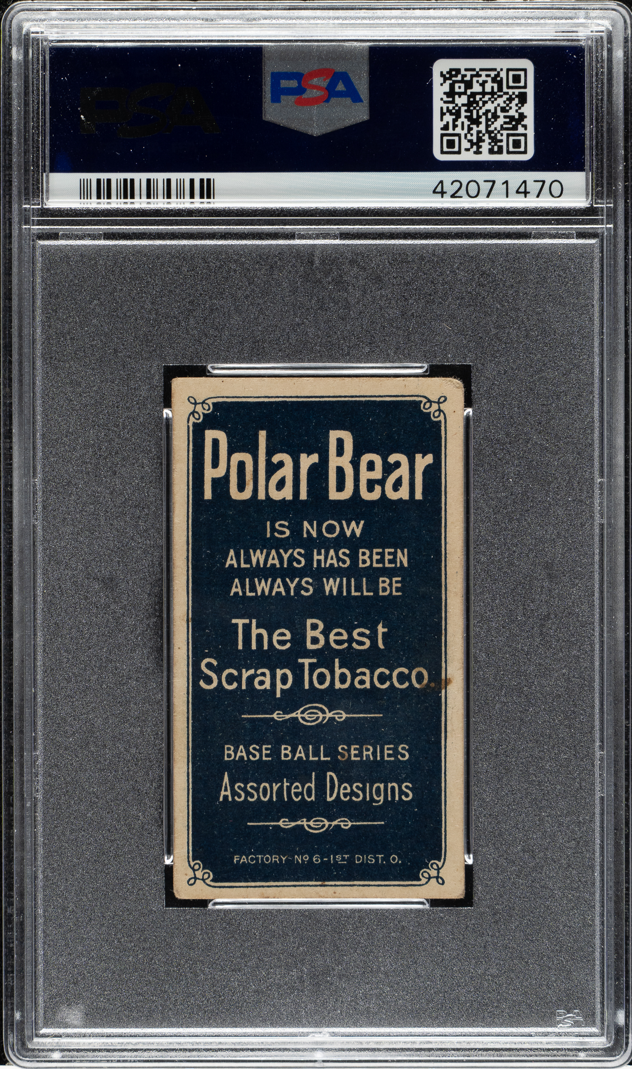 Graded VG 3 by PSA. Beautiful example of the rare Ray Demmitt, St. Louis, T206 variation. Polar Bear was the only company to issue this variation, no doubt contributing to its significant rarity. T206 cards issued with Polar Bear tobacco were not well protected from the accompanying product, so almost all Demmitts have significant condition problems, including at least some tobacco staining. This example, amazingly, has virtually no staining. The card displays brilliant colors, excellent registration, honest corner wear, and outstanding centering. The Polar Bear advertising reverse is boldly printed. A small wrinkle above Demmit's shoulder and a tiny spot of paper loss next to his pant leg contribute to the assigned grade. This is a strong example of one of the rarest and most condition-sensitive cards in the classic T206 set.