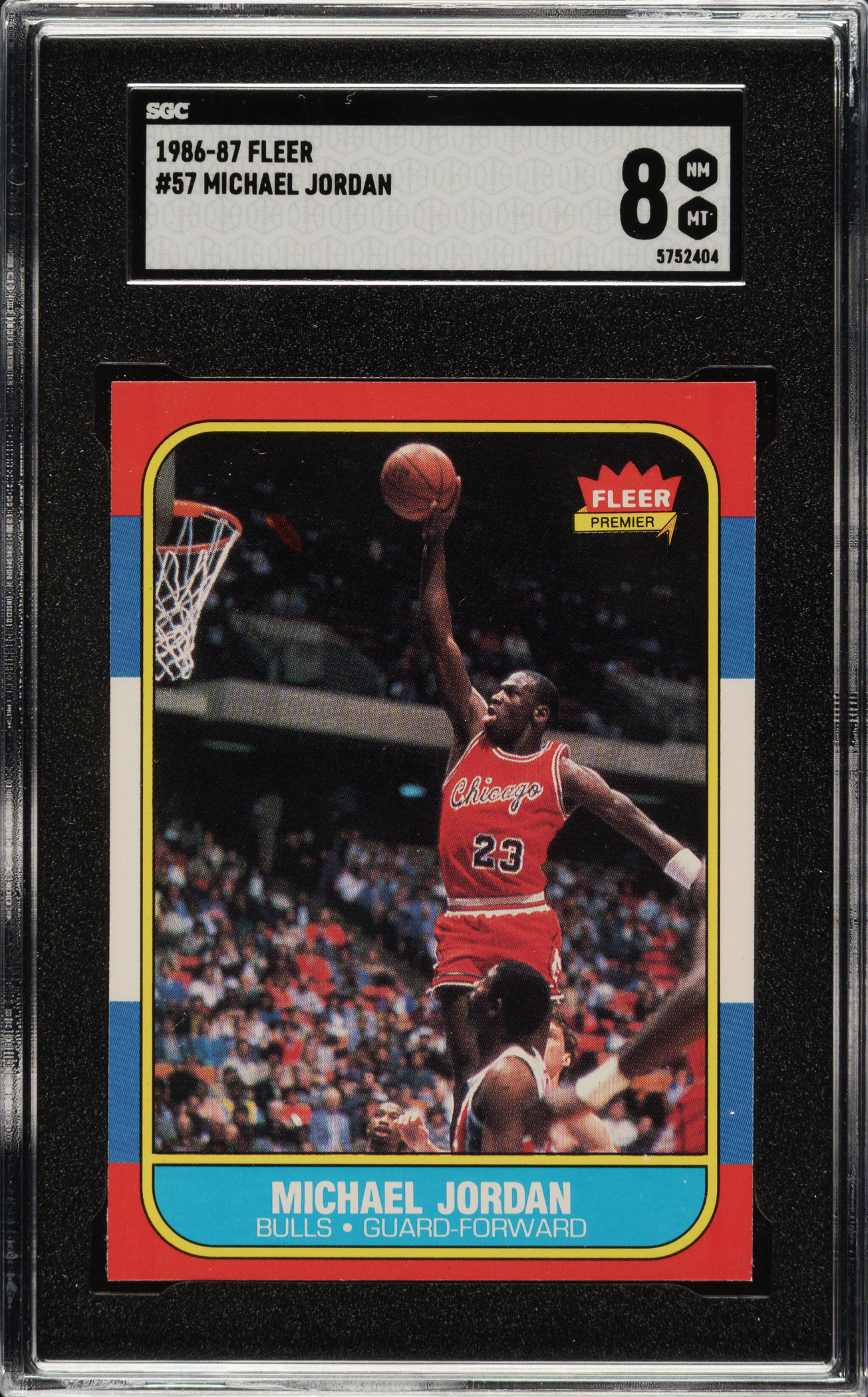Graded NM/MT 8 by SGC. Outstanding high-grade rookie card of Chicago Bulls Hall of Famer Michael Jordan, arguably the greatest basketball player ever. This is a beautiful example of the premier modern-day basketball card. The 1986-1987 Fleer basketball issue is extremely condition-sensitive due to its blue flush-to-the-border design. The offered example boasts bright colors, superb clarity, strong corners, and virtually no chipping to the extreme edges of the condition-sensitive borders. A superb example of this most sought-after modern basketball-card classic.