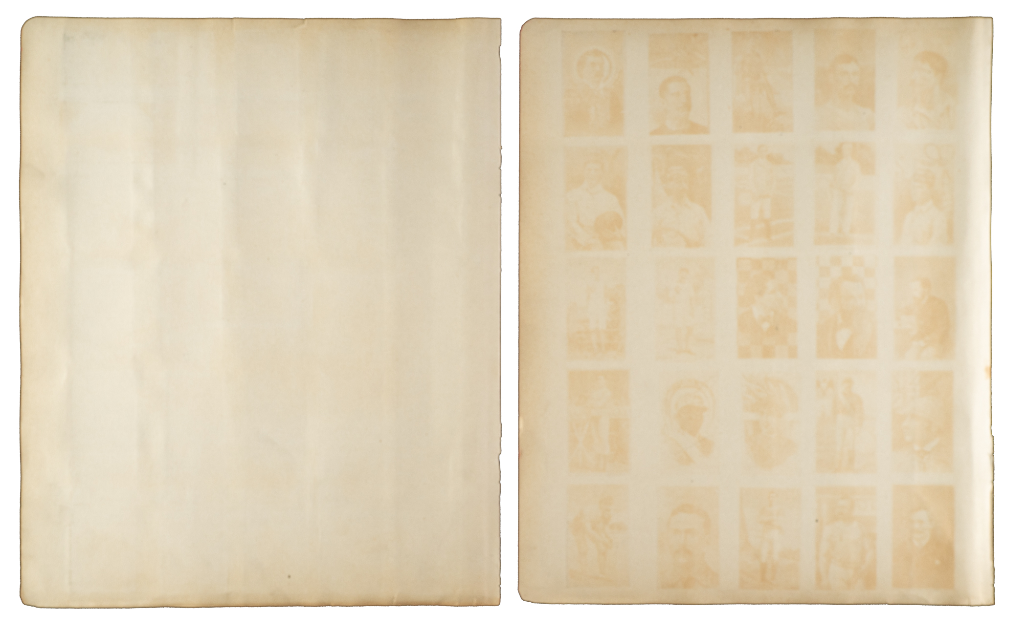 Extraordinary pair of pages featuring images of all 50 cards from the spectacularly colorful N162 Old Judge & Gypsy Queen series. Each of these images was cut out from an 1888 A36 Goodwin & Company premium album and carefully mounted. Baseball players include Anson, Kelly, Keefe, Brouthers, Glasscock, Caruthers, Dunlap, and Andrews. Also included are the additional 42 stars of the sporting world. The N162 Old Judge & Gypsy Queen tobacco cards are universally regarded as among the most beautiful and desirable of all pre-1900 tobacco issues. The cutouts on each page (10.5 x 13 inches) present beautifully with vibrant colors and flawless registration. Total: 2 pages. The size/weight of this item requires that there will be an additional shipping charge for this lot.