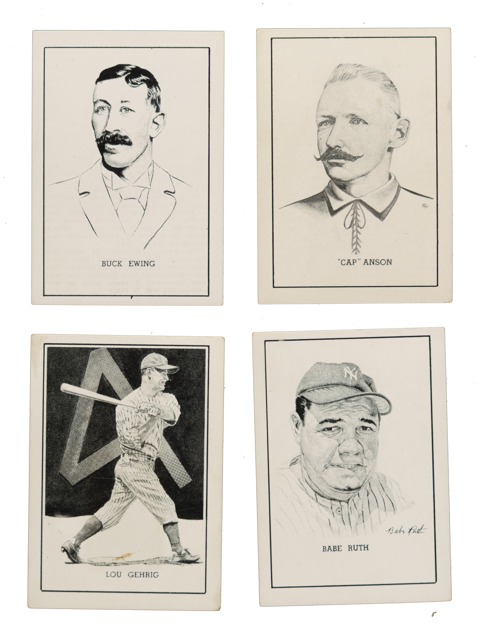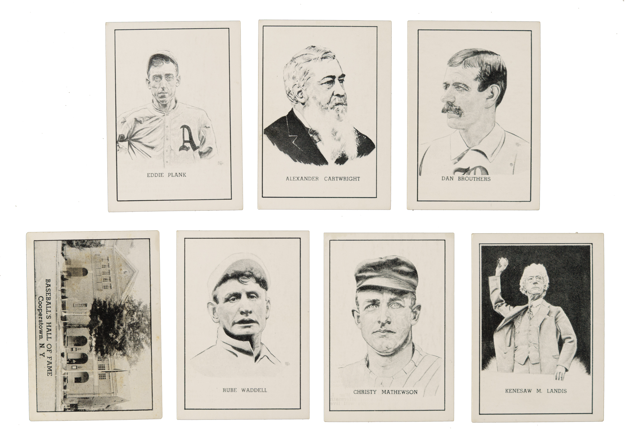 Collection of thirty-six (thirty-four different) 1950-1956 Callahan Hall of Fame cards. Issued annually from 1950 to 1956, the Callahan Hall of Fame card set was the official set of the Hall of Fame. It was updated each year until 1956 with the inductees from that year as well as some corrections and updates. Condition ranges from Vg to Ex-Mt (averaging Vg-Ex/Ex), with four altered by erasure marks. This collection consists of the following: Anson, Bresnahan, Brown, Brouthers, two Bulkeley, Cartwright, Chadwick, Chesbro, Clarke, J. Collins, Comiskey, two Cummings, Delehanty, Ewing, Gehrig (Vg-Ex+). Gehringer, Jennings, Ban Johnson, Keeler, Kelly, Landis, Mathewson (Nr/Mt), McCarthy, McGinnity, Nichols, O'Rourke, Plank, Robinson, Ruth (partially erased mark on front, otherwise Ex), Spalding, Tinker, Waddell, Wright, and Baseball Hall of Fame (exterior view, ends "days are concluded.", Vg). Total: 36 cards.