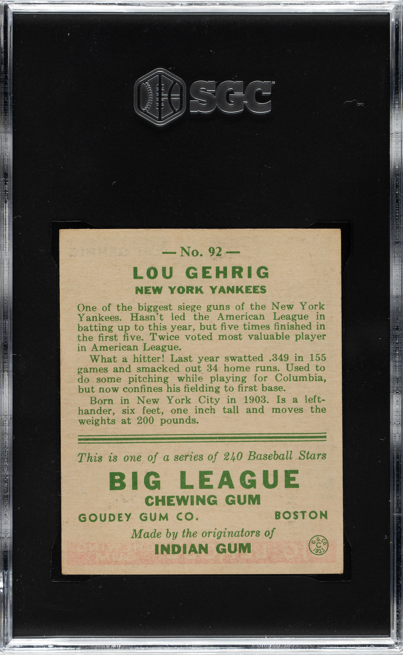 Graded EX 5 by SGC. Solid mid-grade example of one of the most popular of all Lou Gehrig cards and one of the classic 1930s bubble gum cards. This card has vibrant colors, a crisp image, and light corner wear. Clean reverse. This is an ideal card for the collector who wants a very attractive 1933 Goudey #92 Lou Gehrig but is not interested in spending the many additional thousands of dollars an example in a significantly higher grade might run.