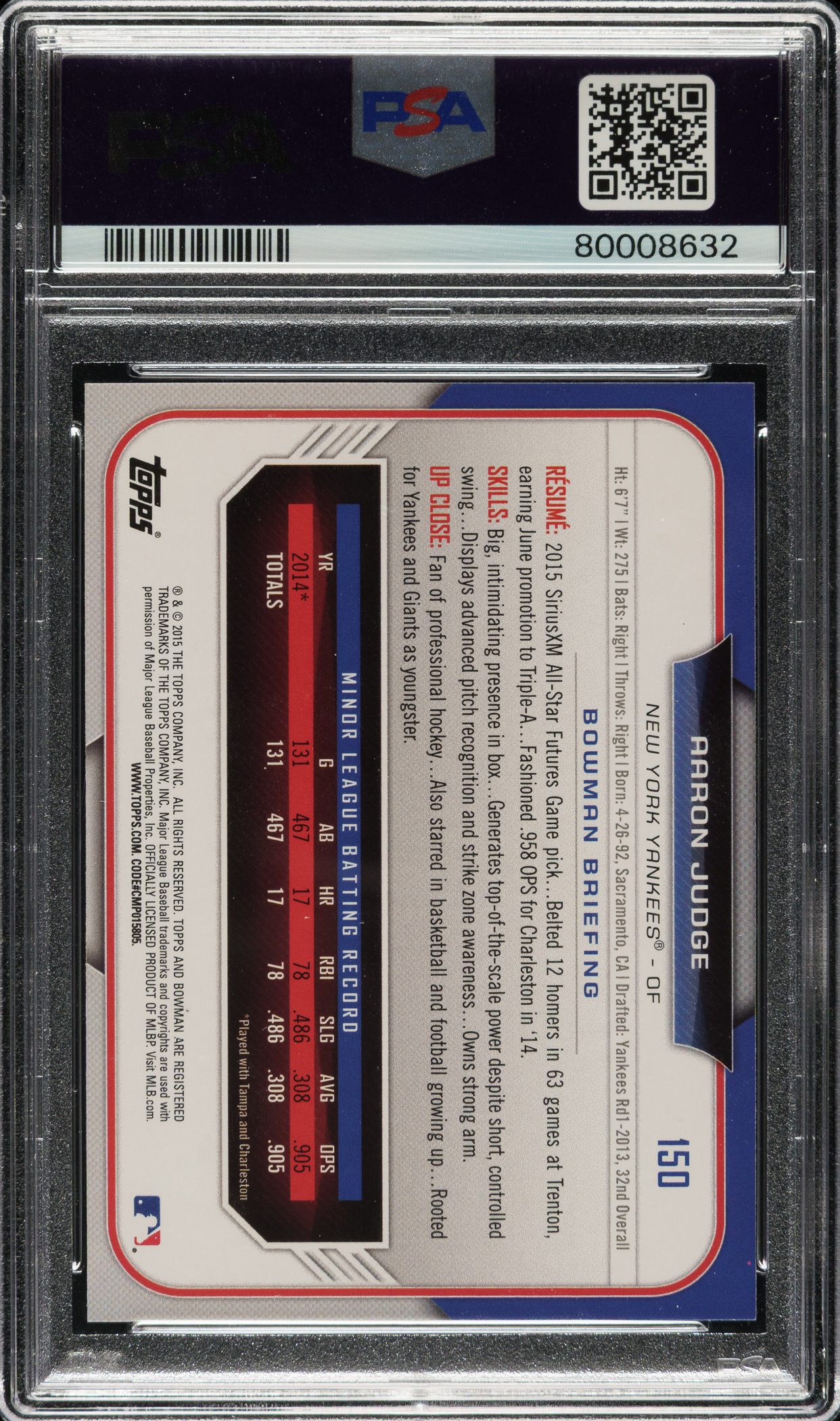 2015 Bowman Chrome Draft #150 Aaron Judge PSA GEM MINT 10