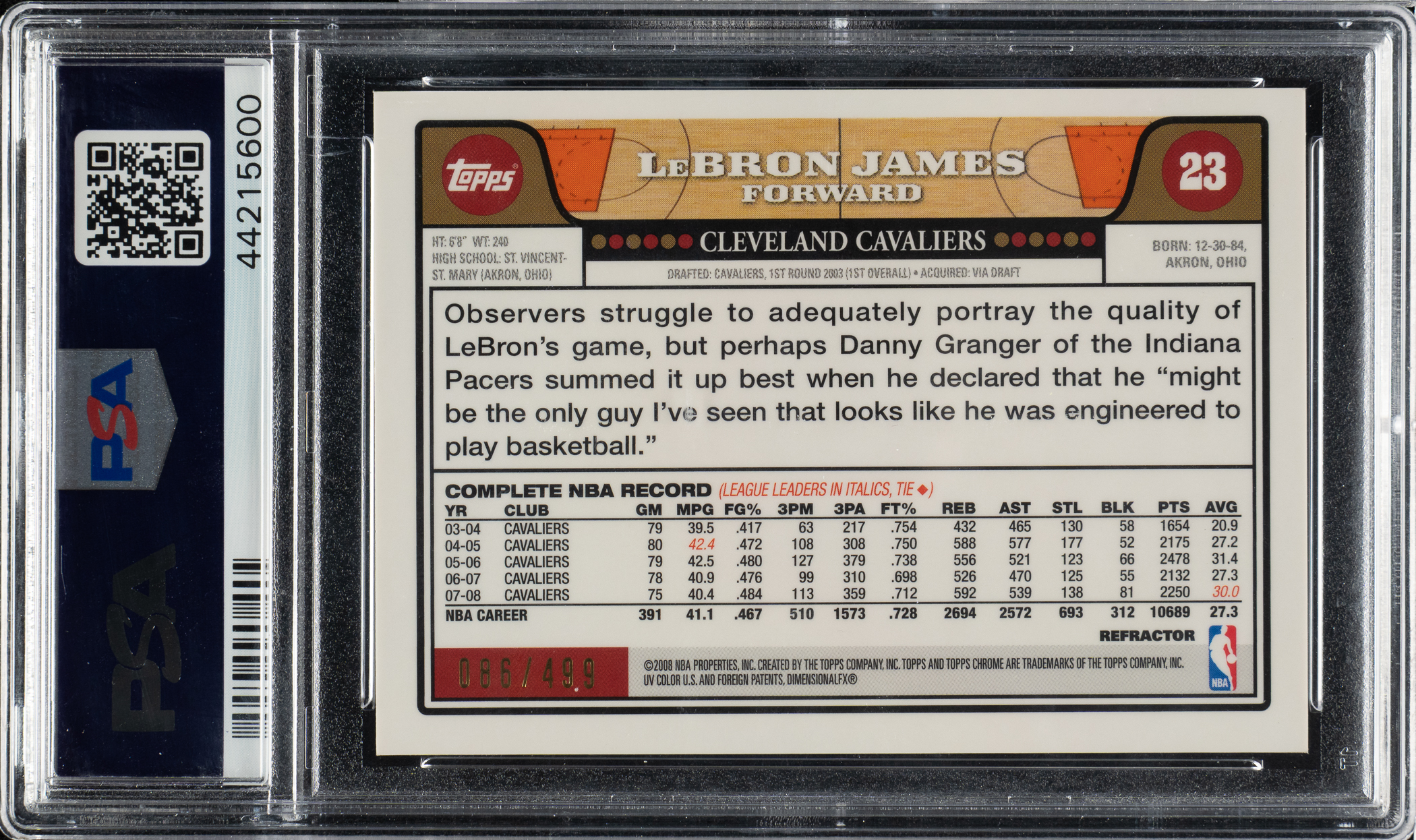 2008-2009 Topps Chrome Basketball #23 LeBron James Orange Refractor #86/499 PSA GEM MINT 10