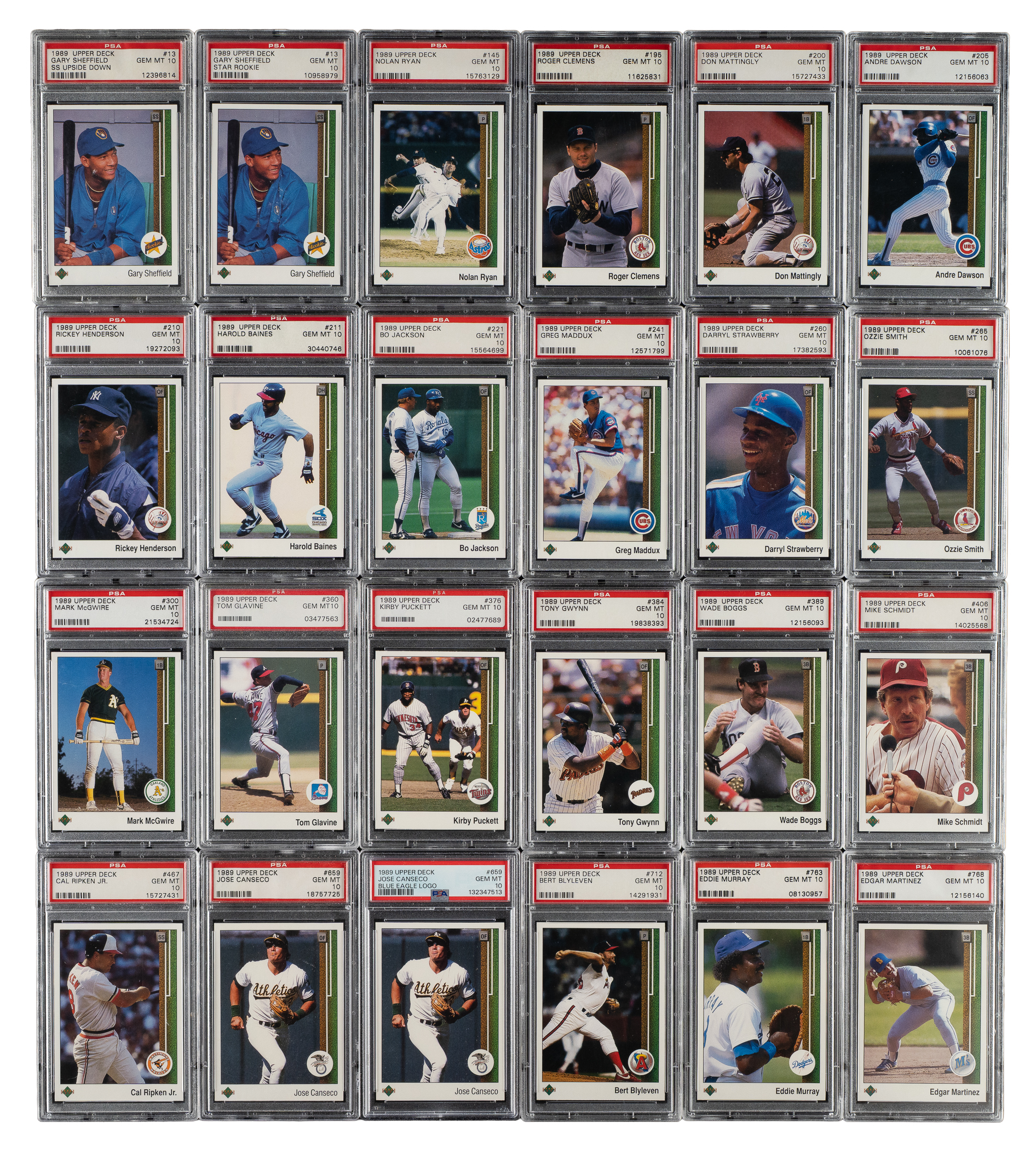 Presented is an astonishing, ultra-high-grade near-complete set of 1989 Upper Deck baseball consisting of 765 different cards, out of 800 in the set. This offering includes both variations/errors of seven cards (#13, 321, 357, 583, 627, 652, and 659), which notably include the Dale Murphy reverse negative and Jose Canseco blue eagle variations. Each card has been professionally graded GEM MINT 10 and encapsulated by PSA (#72 is MINT 9). This near-complete set is currently ranked #1 on the PSA Set Registry for the 1989 Upper Deck Master set. Missing the following 35 cards for completion: #7, 10, 46, 70, 78, 90, 131, 135, 181, 194, 244, 331, 420, 428, 473, 476, 493, 537, 539, 540, 569, 596, 599, 600, 602, 607, 610, 641, 691, 694, 701, 710, 711, 766, and 800. Each card is absolutely deserving of its GEM MINT status, with bright colors, perfect centering, and four sharp corners. The 1989 Upper Deck set, which is one of the most popular sets of the 1980s, includes rookie cards of Hall of Famers Ken Griffey Jr., Randy Johnson, Craig Biggio, and John Smoltz. This is an incredible opportunity to acquire the overwhelmingly significant foundation of a complete set, which would be nearly impossible to replicate today given the cost of grading alone. This is an outstanding near-complete set, assembled with a strict focus on ultra-high grade, that would be a worthy addition to even the most advanced collection. Total: 772 cards (near set of 765 plus seven variations). The size/weight of this item requires that there will be an additional shipping charge for this lot.