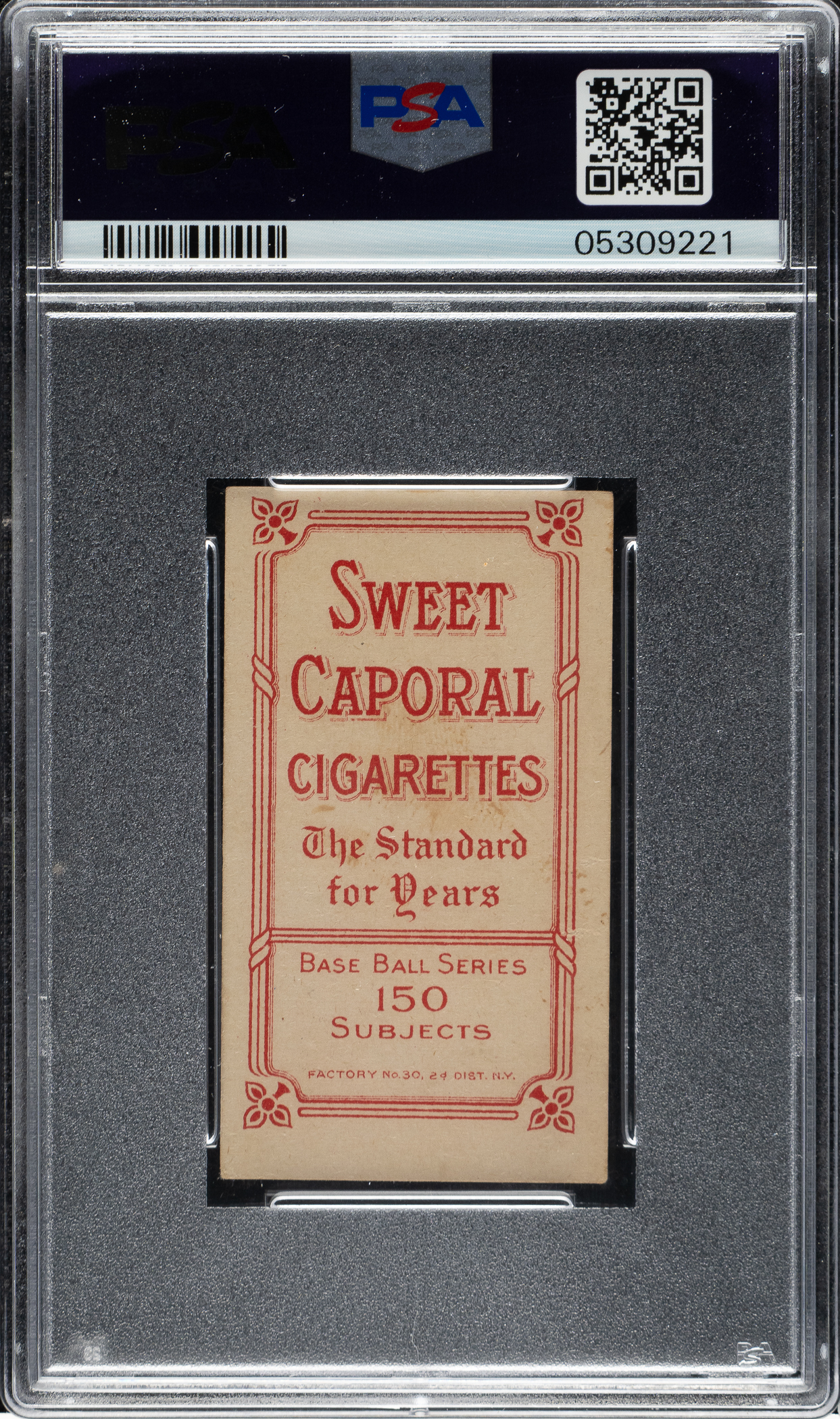 Graded EX 5 (MC) by PSA. Very attractive example of this classic tobacco card of Hall of Famer Ty Cobb. The green background pose has long been considered the rarest of the four poses of Cobb in the T206 set. The offered example has vibrant colors, a crisp image, and light corner wear. Centered toward the extreme top, which accounts for the qualifier. The Sweet Caporal 150/30 advertising reverse is boldly printed. A strong example of one Cobb's most popular cards from the premier tobacco issue of the 1910 era.